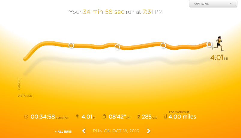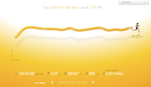 Y la verdad es que quiero recomendar del todo el Nike+. No tanto porque me mide las distancias y calorias en mi ipod sino porque en el sitio lleva un registro muy motivador de todas mis carreras.
