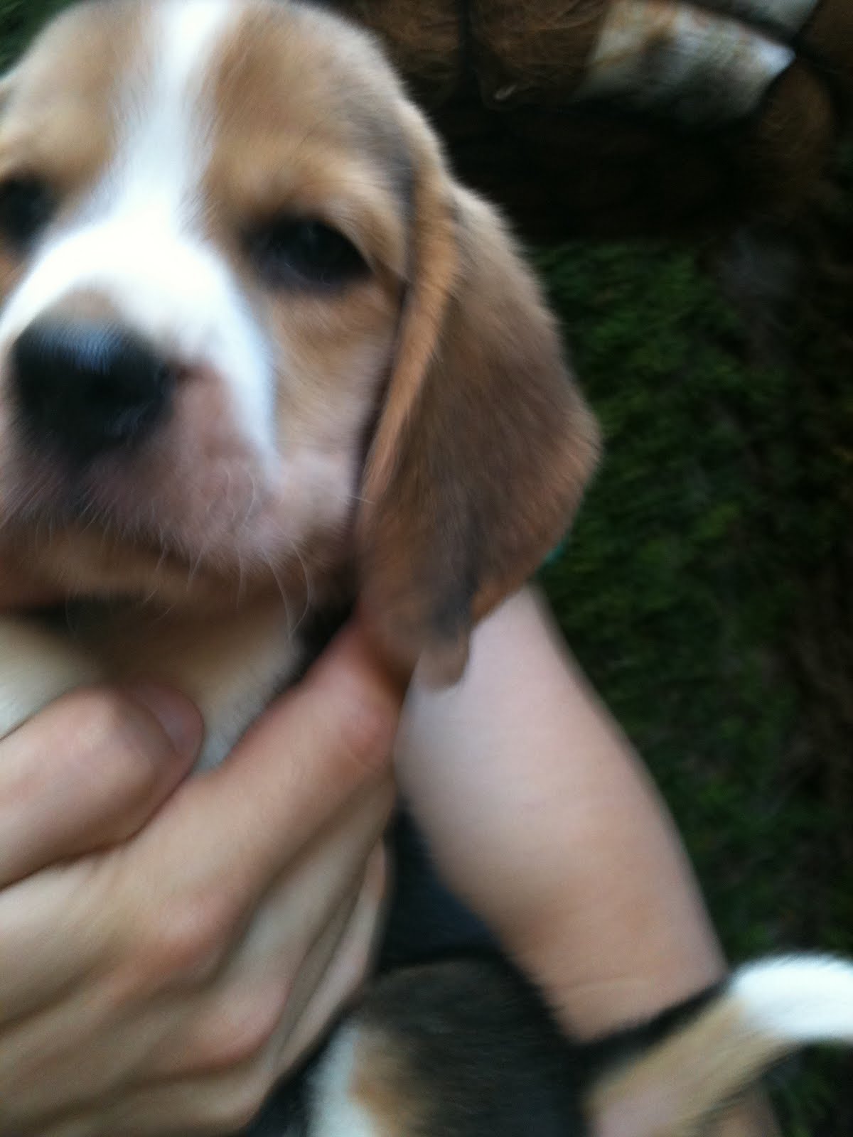 Oficialmente quiero presumir a mi pequeño. Les presento a McQueen. Así es, como el Rayo McQueen. Es un Beagle de mes y medio, mide como 20 cm de alto y pesa aproximadamente lo que pesa un litro de leche (o menos). Tiene su carita color blanco con café, la espalda en negro y las patitas blancas.