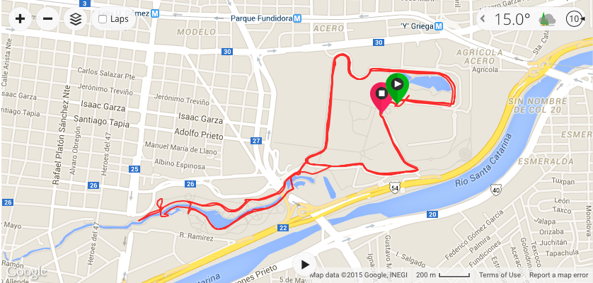 En resumidas cuentas, la cuesta final de un entrenamiento largo para una carrera importante nunca es fácil. Pero no todo ha sido malo, también he tenido algunos buenos entrenamientos que pronto les contaré. El sábado por ejemplo, por segundo fin consecutivo nos fuimos a fundidora a correr 15K. La ventaja de esta ruta es que es plana, solo que hoy metimos un poco de variedad corriendo también por Santa Lucía y eso si incluye algunos puentes. Esta fue la ruta: